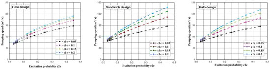 In order to compare the performance of these different designs, Figure 6 and Figure 7 show individual dependencies of S and P on c1e and c2e, respectively. In general, the order of the system pumping speed is sandwich > halo > 8-tube; the order of the system separation efficiency is 8-tube > halo > sandwich. Since these two orders are opposing, the design with the lowest pumping speed achieves the highest separation factor for deuterium gas molecules, which means a trade-off should be made in the selection of the MFP design.