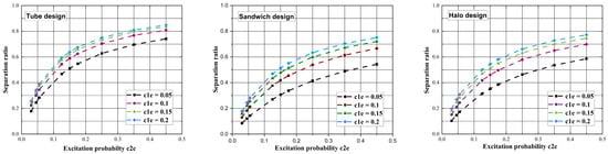 Table 2 and Table 3 list the simulation results of the system pumping speed S and the separation factor P. It is easy to know that S and P will increase with the permeation probability c1e and the excitation probability c2e, and all three designs will deliver the highest system pumping speed and highest separation factor under the best combination of permeation and excitation (c1e = 0.2 and c2e = 0.45).