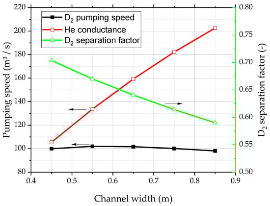 In a study of the impact of channel width modification, moderate values of c1e = 0.1 and c2e = 0.35 are used, and the sticking coefficient on the system outlet (the flange) remains as stk = 0.04, supposing the same downstream pumping ability. Figure 8 shows that the He conductance increases with the width of the MFP channel but the separation ratio for D2 decreases. However, the pumping speed for D2 approximately remains the same for the investigated parameter space.