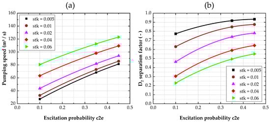 System performance versus the sticking coefficient of the system outlet. (a) Pumping speed; (b) D2 separation factor.