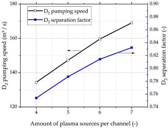 D2 pumping speed and separation factor versus the number of plasma sources (M) in one channel.