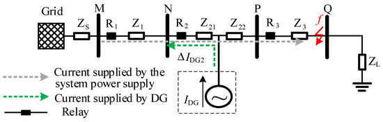 When a three-phase short-circuit fault occurs at f and there is a DG connected to the system, a portion of the total fault current IDG supplied by DG flows upstream of the point of common coupling: