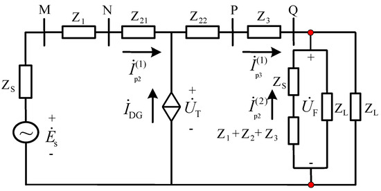 where is the current value of the DG output and is the current value of the DG output acting at protection 3 after impedance shunt. is the system impedance, , is the line impedance between bus MN and bus PQ, is the line impedance between bus N and the DG access point, and is the line impedance between the DG access point and bus P, respectively.
