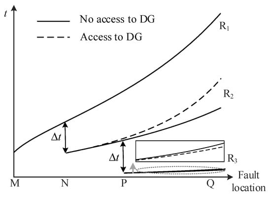 In Equations (25) and (26), is the protection range for the case where DG access decreases the fault current magnitude, and is the protection range for the case where DG access increases the fault current magnitude.
