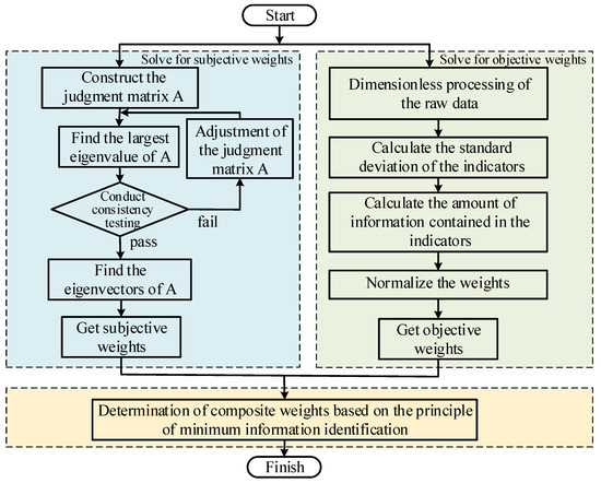 The AHP method incorporates expert experience when performing weight assignments but has some subjective limitations. The CRITIC method relies on raw data and has objective limitations. Based on the limitations of the single assignment method described in the Introduction, in order to guarantee the scientificity of the weights, this paper proposes an improved assignment method. The AHP method is used to subjectively assign weights to the indicators, while the CRITIC method is used to objectively assign weights to the indicators. The combination of subjective and objective methods is based on the principle of minimum information identification to combine the indicators to get the final weights. The calculation process is shown in Figure 5.