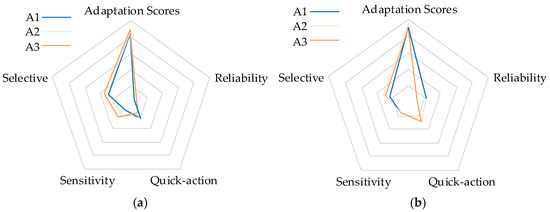 Schematic diagrams of the comprehensive evaluation of the adaptability level of the three types of protection at a DG penetration rate of 50%. (a) Adaptation level for protection 4; (b) adaptation level for protection 5.