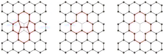 From left to right, Stone–Wales defect, single-vacancy defect, and double-vacancy defect within a graphene lattice, with each defect highlighted in red [21]. Reproduced with permission.