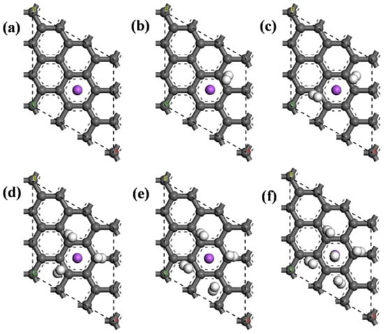 (a–f) Optimized structures of 1–6 hydrogen molecules adsorbed onto single-sided Na-decorated boron-substituted graphene (BSG). The outer- and inner-layer hydrogen molecules are represented by yellow and white molecules, respectively. Sodium, boron, and carbon atoms are represented by purple, pink, and gray molecules, respectively [35]. Reproduced with permission.