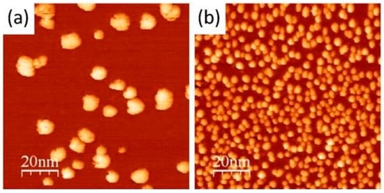 (a) STM image of 0.55 ML (monolayer) titanium nanoparticles dispersed onto a pristine graphene surface. (b) STM image of titanium nanoparticles after sputtering the sample at E = 300 eV for 150 s [49]. Reproduced with permission.