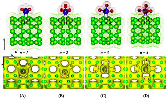 Schematic of Ru-decorated SWCNT + nH2 systems (where n = 1–4). (A) Ru/SWCNT + H2, (B) Ru/SWCNT + 2H2, (C) Ru/SWCNT + 3H2, and (D) Ru/SWCNT + 4H2. The upper images depict the optimized structures. Carbon, ruthenium, and hydrogen atoms are represented by green, blue, and red molecules, respectively. The lower images represent the isosurfaces of optimized systems (isosurface level = 0.09875 e Å−3). Carbon, ruthenium, and hydrogen atoms are represented by green, gray, and orange molecules, respectively [61]. Reproduced with permission.