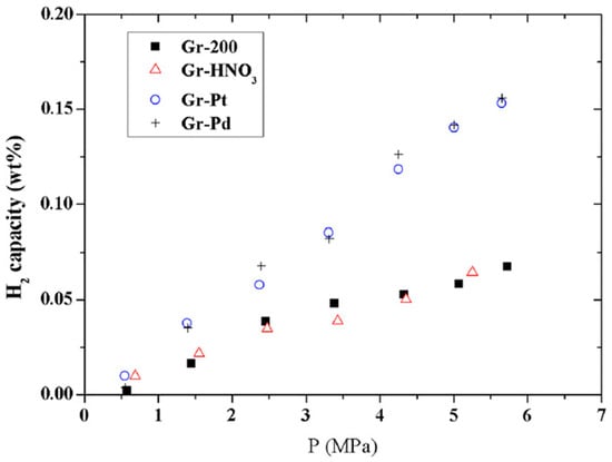 In theory, platinum-decorated graphene denotes a preferred transition metal for graphene decoration, due to its high catalytic activity and its promotion of hydrogen adsorption in all neighboring hexagons on the graphene structure. In the same experimental study carried out by Huang et al., Gr-HNO3 was decorated with Pt to yield Gr-Pt, which increased the hydrogen storage capacity of the pristine graphene sheet from 0.067 wt.% to 0.15 wt.% at 5.7 mPa and 303 K, thereby representing an increase in the measured storage capacity by a factor of 2.23 [63]. Figure 9 highlights the observed hydrogen storage capacities of Gr-Pt as compared with those of Gr-Pd, Gr-HNO, and pristine graphene (Gr-200).