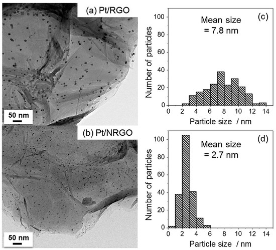TEM images of (a) Pt/RGO and (b) Pt/NRGO. (c,d) The size distributions of Pt nanoparticles on Pt/RGO and Pt/NRGO, respectively, are shown [66]. Reproduced with permission.