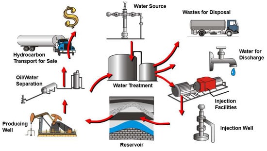 Waterflooding remains the pre-eminent method for improving recovery from oil reservoirs. Its effectiveness, relatively low cost, and easy-to-operate features make it favorable over decades. Nowadays, in the current context of uncertainty regarding the applicability of EOR (enhanced oil recovery) techniques, integrated waterflood asset management has gained unprecedented significance. The concepts and processes of reservoir management were proposed and established in the 1990s by Satter and Thakur [2,3,4]. They emphasized the importance of integrating different disciplines such as reservoir characterization, fluid behavior in the reservoir, drilling and operating wells, surface handling of the fluids, facilities, water system, and field operation (Figure 2) to benefit the most from each project. Furthermore, they highlighted that reservoir management is not confined to the beginning of geologic evaluations, economic justifications, and project approval by management. Instead, these management activities occur from before the commencement of the waterflood until the waterflood becomes uneconomical or transitions into EOR techniques [3].