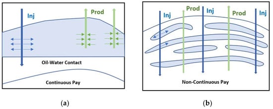 - Lack of fluid communication between injectors and producers due to geological structure (crossbedding, discontinuity, faulting), which impairs sweep efficiency.