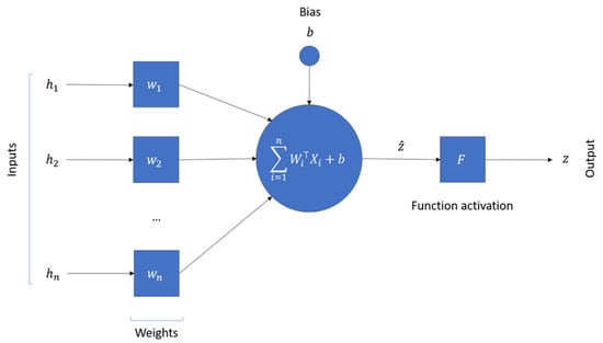 An ANN is a general-purpose approximator for nonlinear functions that consists of an input layer, one or more hidden layers, and an output layer that contains predicted values. Each layer comprises neurons that process information before passing it to the next layer. Connections between neurons have a weight that characterizes the level of connectivity of information passing through these neurons in different layers of the network. The operating principle and mathematical definition of an individual neuron in such a network are shown in Figure 1. A neural network with feedforward signal propagation, consisting of one or many hidden layers, is called a multilayer perceptron.