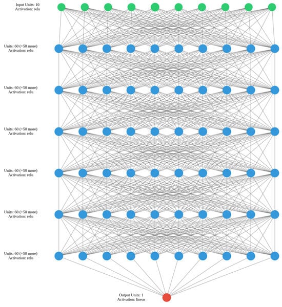 The developed neural network takes 10 parameters of weather conditions at the input layer, after which the signal passes through 6 hidden layers, where each layer contains 60 neurons. Each layer uses a function activation relu: