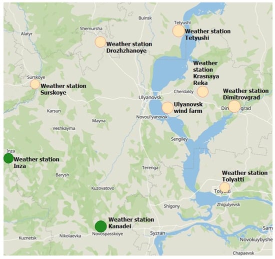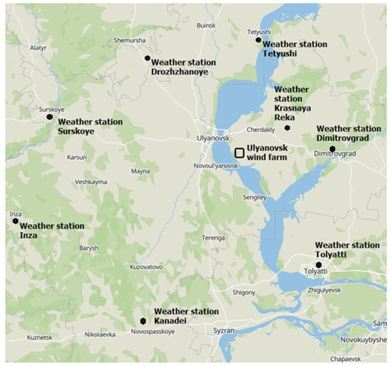 It is necessary to prepare training data to solve a given problem using neural networks. The analysis of the region enabled the identification of eight meteorological stations around the wind farm containing archival weather data (see Figure 3) [49].