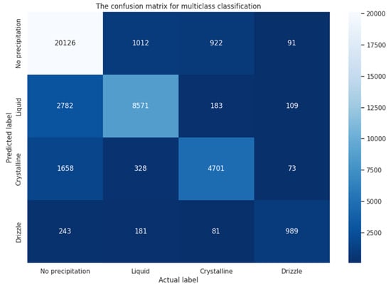 A sufficient level of quality of the proposed model is observed after 1000 years of training. After training on the test set, the results presented in Figure 5 were obtained. The results are presented in the form of an error matrix, which shows that the model works quite accurately. The level of overall accuracy was 81.78%, macro-average recall was 81.07% and macro-average precision was 75.05%. For multi-class classification, macro-average recall and macro-average precision are calculated as: