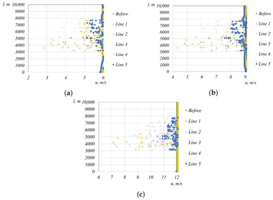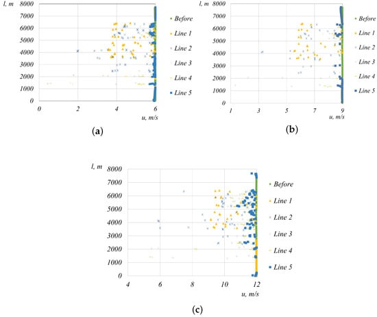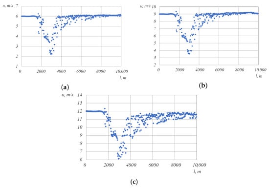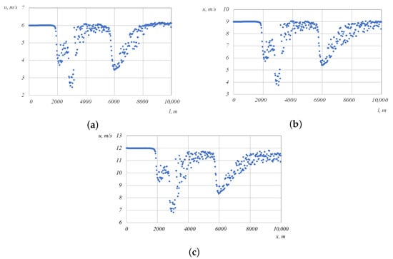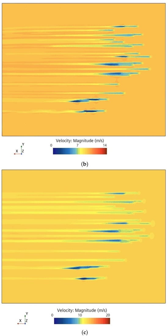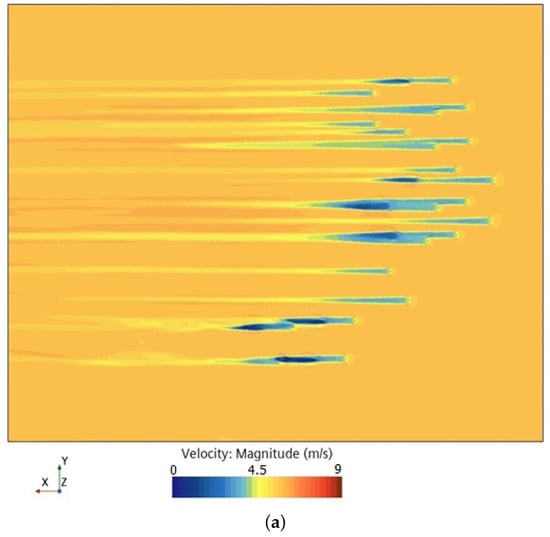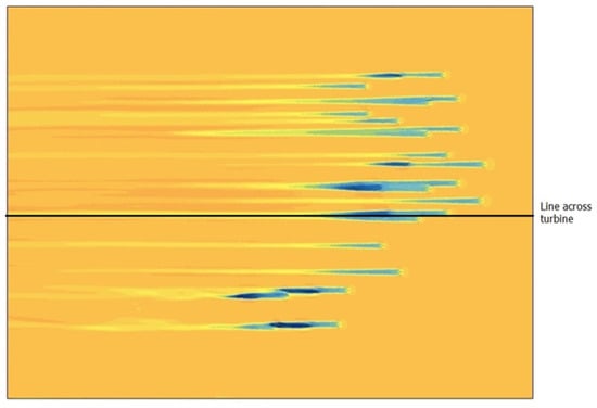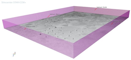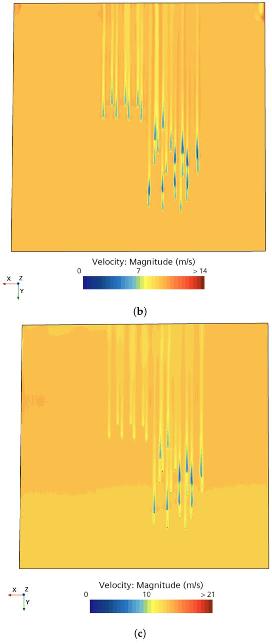 The third method is based on the numerical solution of Navier–Stokes differential equations. This method requires a high spatiotemporal resolution and, therefore, requires considerable computing power. Therefore, it is rarely used to obtain large datasets of turbulent flows with simple structures. The LES method is the optimal approach for modeling because of the trade-off between computer time consumption and calculation accuracy. To optimize the calculation processes, this study proposes an approach based on the use of the ADM model [42,43,44] of a Vestas V126-3.45 MW wind turbine using the one-dimensional impulse method (1D-Momentum), including data on the power curve and simulated wind turbine force coefficients. A tangible advantage of ADM is the simulation of a wind turbine rotor, which greatly simplifies the preparation of the model and structure of the computational grid used. This paper presents the results of modeling the movement of air masses in the area of wind turbines on the scale of the surface boundary layer of the atmosphere for an aligned and staggered layout of wind turbines.