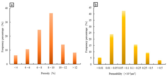 Physical property tests were conducted on 263 core samples from the Chang 6 taken from 12 core wells in the Qingcheng area. The results indicated that the porosity of the reservoir ranged from 4 to 12%, with 60.9% of porosity test data being distributed between 6 and 10% (Figure 2a). The permeability of the reservoir ranged from 0.01 to 0.5 × 10−3 μm2, with 66.4% of permeability test data being distributed between 0.01 and 0.1 × 10−3 μm2 (Figure 2b), indicating a typical tight sandstone reservoir.