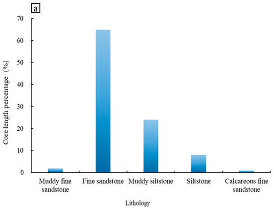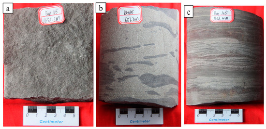 Photos of the cores in the study area. (a,b) Block-bedding fine sandstone, (c,d) silty mudstone, (e) mudstone, and (f) carbonaceous mudstone.