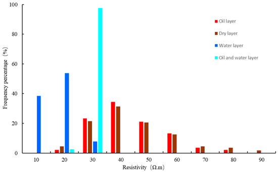 By analyzing the testing and production data of oil from 52 wells in the Chang 6 of the Qingcheng area, four types of fluids were identified in the tight sandstone reservoir, namely, oil, water, oil–water, and dry layers. The resistivities of water, oil–water, oil, and dry layers were concentrated in the ranges of 10 to 30, 20 to 30, 20 to 80, and 20 to 90 Ω·m, respectively (Figure 4). A significant overlap was observed among the four fluid types within the resistivity range of 20 to 30 Ω·m (Figure 4). Moreover, in the resistivity range of 30 to 80 Ω·m, the resistivity distribution characteristics of oil and dry layers were similar. Therefore, identifying the oil, water, oil–water, and dry layers in the tight sandstone using only resistivity curves is difficult.