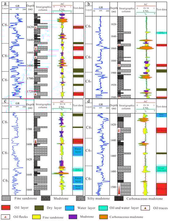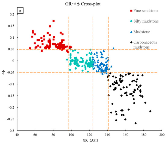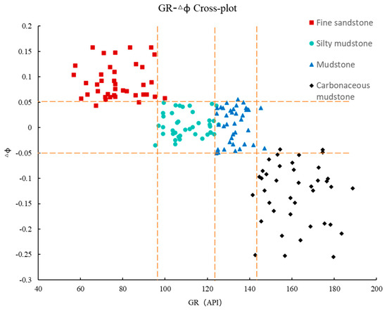 We established a normalized difference curve Δφ (subtracting CNL* values from AC* values). The lithology cross-plot was constructed by combining the natural gamma curve with the difference, acoustic wave, and density curves, respectively (Figure 9), and was used to identify the tight fine sandstone, silty mudstone, mudstone, and carbonaceous mudstone. The key aspect is to distinguish the tight fine sandstone from the other lithologies. Based on the method of normalized superposition of neutron and acoustic time-difference curves, the identification criteria for the four lithologies in the Chang 6 in the study area were established (Figure 9 and Table 1). In particular, the natural gamma value of the tight fine sandstone was less than 96 API, and the normalized difference value (Δφ) was more than 0.05. For the silty mudstone, the natural gamma value ranged between 96 and 123 API, and the normalized difference value (Δφ) was between −0.05 and 0.05. Mudstone showed a natural gamma value between 123 and 141 API, and the normalized difference value (Δφ) was between −0.05 and 0.05. The natural gamma value of carbonaceous mudstone ranged between 141 and 200 API, and the normalized difference value (Δφ) was less than −0.05.