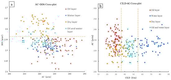 Identification plate of the oil and water layers in a tight sandstone reservoir in the Chang 6 in the study area. Cross-plots of (a) density versus acoustic time difference and (b) induced conductivity versus acoustic time difference. The orange lines are the dividing lines.