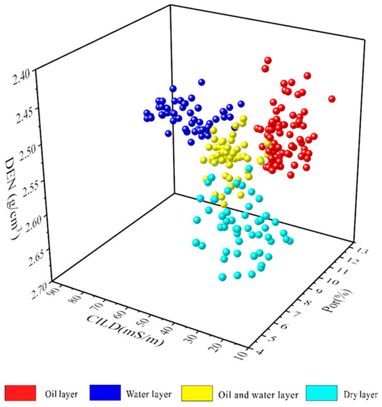 In this study, 230 data points were selected from 52 wells to establish an induced conductivity–porosity–density intersection plate (Figure 11). Notably, the fluid types such as the oil, water, and oil–water layers, in the tight sandstone were distinguished. The identification markers of the tight oil layer were as follows: induced conductivity between 18 and 28.1 mS/m, density between 2.42 and 2.56 g/cm3, and porosity of more than 9.5%. The identification markers of the tight water layer were as follows: induced conductivity higher than 48.6 mS/m, density between 2.46 and 2.56 g/cm3, and porosity higher than 9.5%. Similarly, for the tight dry layers, the identification criteria were as follows: induced conductivity greater than 19.2–41.65 mS/m, density ranging between 2.54 and 2.68 g/cm3, and porosity less than 9.5%. For the oil–water layers, the identification criteria were as follows: conductivity ranging between 34.8 and 49.6 mS/m, density between 2.46 and 2.58 g/cm3, and porosity between 8.8 and 10.1%.