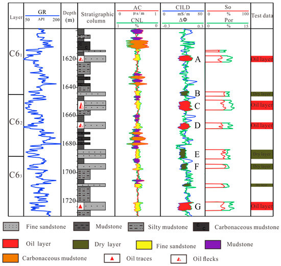 The tight fine sandstone was identified using the tight reservoir lithology identification standards in combination with gamma curves. The tight fine sandstone section in well W1 comprised segments A, B, C, D, E, F, and G, as shown in Figure 12. Within this section, thick beds of silty mudstone, mudstone, and carbonaceous mudstone were interbedded. Based on the aforementioned lithology identification, the induced conductivity curve was superimposed on the normalized difference curve Δφ. We determined that the sections A, C, D, and G (highlighted with red fill) in Figure 12 were oil layers, which is consistent with the results of oil testing. For all four sections, the thickness of oil layers typically ranged from 5 to 8 m, with average porosity, induced conductivity, and oil-bearing saturation values of 10.8%, 26.3 mS/m, and 68%, respectively, which are characteristic of tight oil layers. Conversely, sections B, E, and F in Figure 12 (highlighted with brown–green fill) were identified as dry layers whose thickness ranged from 3 to 6 m, with porosity and induced conductivity values of 8.3% and 33.8 mS/m, respectively, characteristic of typical dry layers.
