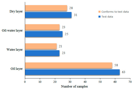 To verify the accuracy of the identification of the fluid types using the induced conductivity–porosity–density cross-plot, the results of the identification of oil, water, dry, and oil–water layers in the Chang 6 from 36 wells in the study area were compared with actual shot-hole test results (Figure 14). There were 63 test data points for oil layers, among which 58 conformed to test data, resulting in an accuracy rate of 92.1%. For the water layers, there were 23 test data points, with 21 conforming to test data, yielding an accuracy rate of 91.3%. The dry layers had 31 test data points, with 28 conforming to test data, resulting in an accuracy rate of 90.3%. For the oil–water layers, there were 25 test data points, with 23 conforming to test data, resulting in an accuracy rate of 92%. Table 2 presents the validation results of the partial identification and actual perforation test data, indicating that the results of the identification of the oil–water layer using the induced conductivity–porosity–density cross-plot method were consistent with the actual perforation test results.