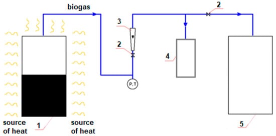 The laboratory production of biogas in a goat manure bed is shown in the diagram—Figure 2. The method of testing the substrate in laboratory conditions for the production of raw biomethane is characterized by the fact that in a glass vessel–reactor (photofermenter with a capacity of 0.00075 m3), the bed is located in in the form of goat manure with a capacity of 0.000375 m3. After sealing the photofermenter, a flexible flow channel was led from the photofermenter to a closed tank constituting a biogas storage facility.