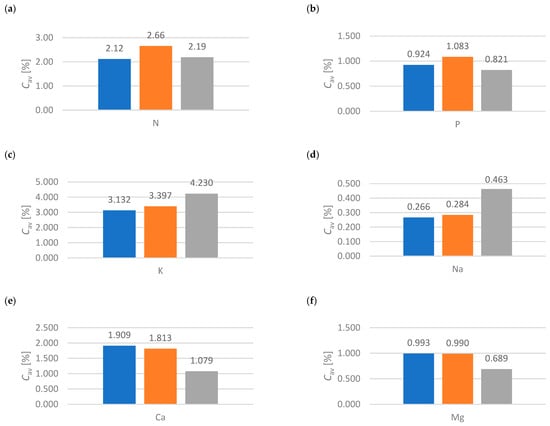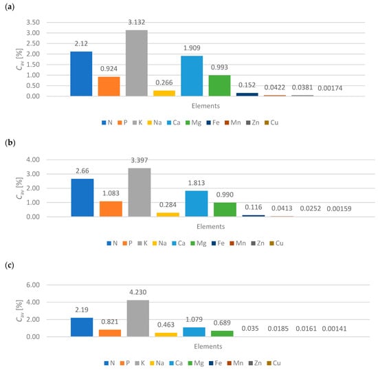 In accordance with the ISO 11465:1994 standard [], dry matter (T = 378.15 K) was determined using the gravimetric method. In accordance with the standard PB/31/12:2014* [], PB/31/14:2014* [] and PN-91/R-04014* [], samples were mineralized (applied to plant material and natural fertilizers) in concentrated mineral acids into general components (macro- and micro-nutrients). In accordance with the standard PB/31/09:2014* [], the samples were mineralized (applied to plant material and natural fertilizers) in concentrated mineral acids to produce nitrogen. Nitrogen and phosphorus were determined according to the SKALAR methodology []. In accordance with the PN-ISO 9964-1:1994 [] and PN-ISO 9964-2/AK:1997 [] standards, sodium, potassium, magnesium and calcium were determined using atomic absorption spectrometry. In accordance with the PN-ISO 8288:2002 standard [], iron, manganese, zinc and copper were determined using atomic absorption spectrometry.
