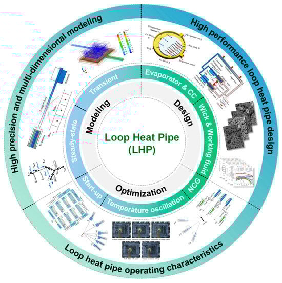In summary, this paper comprehensively studies and analyzes key LHP technologies. The main content of this paper is outlined in Figure 1. Section 2 discusses the thermohydraulic modeling of LHPs, covering both steady-state and transient models and their application in optimizing LHP performance. Section 3 reviews the component design of LHPs, focusing on optimizing the evaporator, wick structure, and compensation chamber, and evaluating their impact on overall thermal performance. Section 4 assesses the selection of various working fluids, including organic, inorganic, and nanofluids, analyzing their thermal properties and effectiveness in LHP applications. Section 5 explores the operational characteristics of LHPs, emphasizing startup behavior, temperature oscillation, and the effects of NCGs on LHP operation. This review provides theoretical support and design guidance for developing LHP technology.