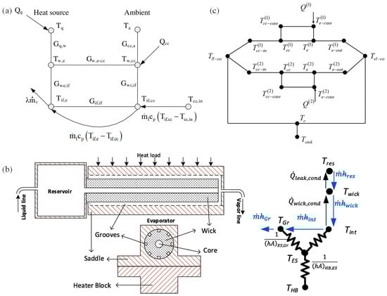 Thermal network diagrams in different models. (a) Evaporator and compensation chamber thermal network diagram [33]; (b) Evaporator diagram and node network [36]; (c) DE-LHP thermal network [37].