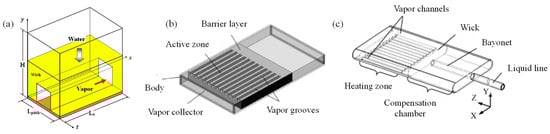 Nowadays, the rapid development of aerospace technology, high-power electronics, data centers, and new energy vehicles has urgently increased the demand for thermal management [1,2]. Thermal components in these fields, such as spacecraft thermal control systems, chips, power batteries, and electric drives, have experienced notable increases in heat flux density [3,4,5]. Consequently, finding efficient thermal management solutions is crucial [6,7,8]. Loop heat pipes (LHPs), known for their excellent heat transfer efficiency and reliability, have emerged as promising candidates for managing high temperatures, high-heat flux densities, and high-power dissipation scenarios, attracting considerable research and attention [9,10].
