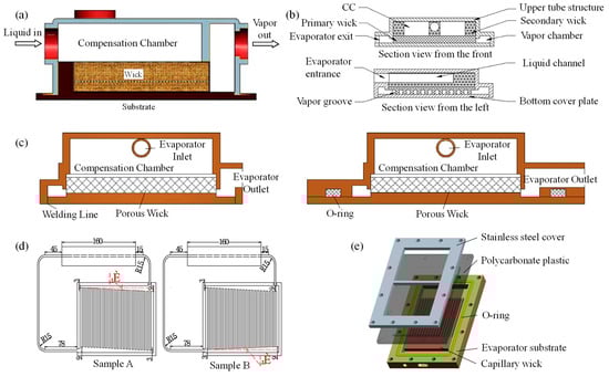 Different evaporators and compensation chamber structure diagrams. (a) Structure of the mLHP’s evaporator [69]; (b) Evaporator structure [70].