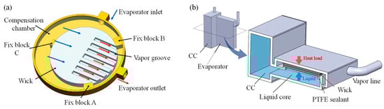 A novel micro LHP (mLHP) with an eccentric evaporator was developed by Tian et al. [69], as illustrated in Figure 8a. This design permitted stable operation across a heat load range from 2 W to 60 W, with a minimum evaporator thermal resistance of 0.27 °C/W at a maximum heat load of 60 W and an overall system thermal resistance of approximately 1.3 °C/W. Their study also highlighted the effects of heat sink temperature on mLHP performance. Furthermore, Odagiri and Nagano [70] optimized the width and number of vapor grooves in a planar rectangular evaporator, enhancing heat transfer performance under high-heat flux conditions. They designed an evaporator with 84 vapor grooves, each 0.3 mm wide, within a porous wick, as shown in Figure 8b. A comparative analysis of cylindrical and flat LHP evaporators was conducted by Maydanik et al. [71], discovering comparable thermal resistance and maximum heat flux. The cylindrical evaporator exhibited a marginal thermal performance advantage at non-horizontal angles, while the flat evaporator was more compact and lighter. Introducing an evaporator design for a dual compensation chamber LHP (DCCLHP), Wang et al. [72] created a configuration that allowed effective functioning even with adverse inclinations between the evaporator and the compensation chamber. This innovation expanded the potential for ground applications. A flat LHP (FLHP) evaporator with a reinforced structure was designed by Zhang et al. [73] and can withstand high working fluid pressures. This design is suitable for cooling equipment in space without additional brackets, thereby reducing thermal resistance. Li et al. [74] compared three LHP evaporator designs with varying configurations of vapor channels and wick contact. The results indicated that reducing the contact area between the wick and the heating surface improved LHP performance. The configuration with a separated wick and heating surface exhibited the lowest operating temperature and shortest start-up time. Xiong et al. [75] developed an LHP evaporator with dual-row vapor channels in a porous copper wick to enhance heat transfer performance. This configuration demonstrated superior thermal characteristics when handling high-heat flux server CPUs. Incorporating small copper powder particles and stainless-steel rings enhanced structural strength and improved liquid saturation, resulting in better operational thermal characteristics under high-heat flux conditions.