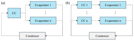 The increasing integration of high-power electronic devices has created a critical need for efficient thermal management. High-heat flux and multiple heat sources present significant challenges, particularly in complex thermal environments. Multi-evaporator two-phase loop systems have demonstrated outstanding potential in such conditions, especially as thermal control systems transition to more integrated approaches [17]. Multi-evaporator LHPs are typically classified into two categories: those with multiple evaporators sharing a single compensation chamber and those with multiple evaporators, each with their own compensation chamber, as illustrated in Figure 9. The former configuration is often susceptible to instability during start-up and exhibits reduced heat transfer capability. In contrast, the latter maintains the advantages of traditional LHPs but may limit the number of evaporators.