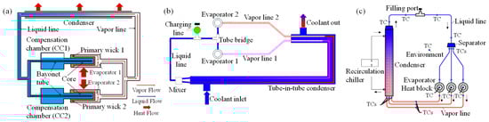 Early studies conducted theoretical analysis and tests on dual-evaporator LHPs [76], focusing on regular operation and heat load-sharing modes. This foundational work provided critical insights into the behavior of multi-evaporator LHPs under varying thermal loads. Building on this, subsequent research introduced a multi-evaporator LHP (MLHP) [77,78], as shown in Figure 10a, which offers flexible thermal management by allowing simultaneous heating of two evaporators or selective heating in a heat load-sharing mode. Visual experiments under gravity-assisted conditions revealed the vapor–liquid distribution within the evaporator core and compensation chamber and the two-phase flow regions in the condenser, thereby demonstrating the practical applications of earlier theoretical findings. Further development led to a dual-evaporator LHP with an eccentric evaporator-compensation chamber configuration [79]. This innovative design maintains the evaporator and compensation chamber on the same horizontal plane in a gravitational field, reducing liquid backflow. Enhancements to the multi-evaporator design resulted in a dual-evaporator flat LHP with independent vapor transport lines for each evaporator [80], as illustrated in Figure 10b. This configuration includes interconnected compensation chambers and pipes, circumventing direct vapor interference between evaporators while effectively dissipating heat from two separate sources.