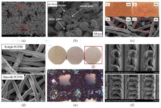 SEM images of metal-based wicks. (a) Biporous wick [85]; (b) Primary layer wick [86]; (c) Composite PCFSS wick: (i,iii) front side of 60% porosity; (ii,iv) reverse side of 70% porosity. (Dashed line box: pore size) [87]; (d) PCFSS wick [88]; (e) 3D-printed wick (Red box: sample C) [89]. (f) MGRA [90].