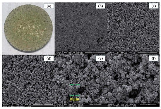 Surface morphologies of the pouring surface at different magnifications [98]. (a) the pouring porous wick image. (b) ×100. (c) ×500. (d) ×1000. (e) ×3000. (f) ×4000.
