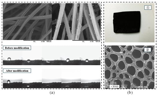 Carbon-based wicks. (a) SEM and surface water droplet wettability of PAN-based carbon fiber felt before and after modification [104]; (b) Photographic view and SEM image of prepared charcoal: ① Photographic view of prepared charcoal; ② SEM image of Charcoal at 3000×. [107].