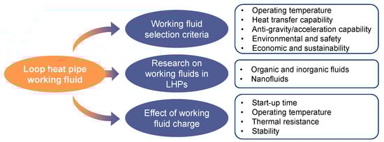 Selecting the optimal working fluid is crucial for the efficiency and reliability of LHPs. The thermophysical properties of the fluid, such as thermal conductivity, viscosity, and specific heat, determine its heat transfer efficiency. Key considerations include the operational temperature range, the fluid’s ability to transfer heat during phase changes, and its resistance to gravity and acceleration forces, which can impact performance in various orientations and conditions. Beyond thermal properties, other factors like safety, environmental friendliness, and cost are also important. The fluid should not pose significant health or environmental risks and be economically viable for widespread use. Various organic fluids, such as ethanol and methanol, and inorganic fluids, like ammonia, have been widely studied for their favorable thermophysical properties. Nanofluids, which are fluids with suspended nanoparticles, offer enhanced thermal conductivity and have become a significant area of research. These fluids can potentially improve the heat transfer performance of LHPs significantly. Proper fluid charging levels are also critical, as they ensure efficient startup and stable operation, balancing rapid heat transfer and minimizing thermal resistance. Overcharging or undercharging can lead to operational inefficiencies or failures. An overview of the research on LHP working fluids is shown in Figure 15, highlighting the various types of fluids studied and their respective impacts on LHP performance.