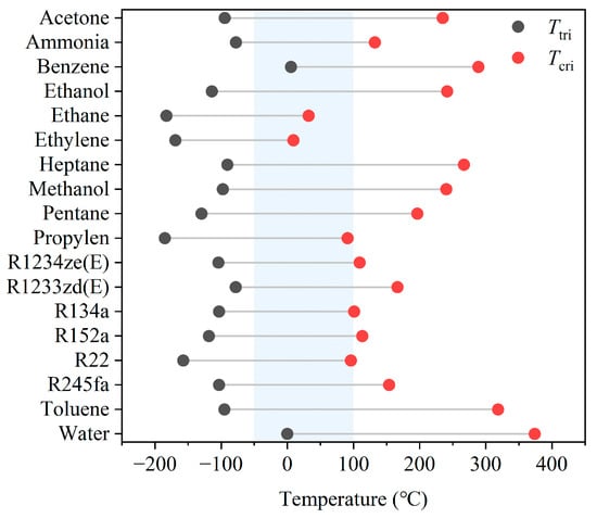 The operating temperature range represents the primary consideration when selecting working fluids for LHPs. The working fluid must be able to undergo phase changes between vapor and liquid within this range while maintaining good thermophysical properties throughout. To ensure proper LHP operation, the melting point of the working fluid should be below the lowest operating temperature of the LHP, which the triple point temperature (Ttri) can also represent. Additionally, the critical temperature (Tcri) should be above the highest operating temperature of the LHP. This precautionary measure prevents the fluid from entering solid or supercritical states within the operating temperature range, thereby ensuring effective heat transfer. For most applications requiring thermal management, such as aerospace electronics and electric vehicles, the optimal and reliable operating temperature range is between −50 °C and 100 °C. Figure 16 compares the two-phase temperature ranges of the typical candidate working fluids for LHPs mentioned in existing studies.