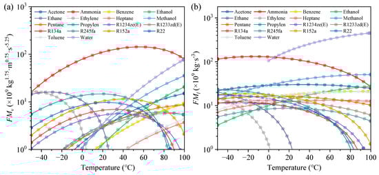 The merit numbers of common working fluids at different temperatures. (a) FMv; (b) FMl.
