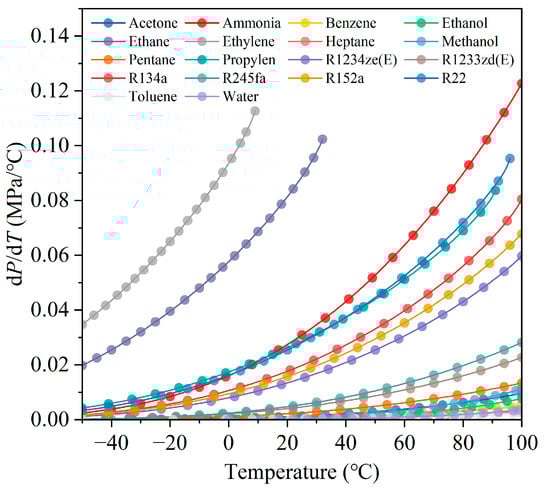 Under microgravity conditions, the absence of buoyancy-driven natural convection necessitates reliance on the working fluid’s capillary action within the porous wick. The slope of the saturation line on the P-T diagram (dP/dT) is a critical parameter, as a higher dP/dT value indicates better performance under varying thermal conditions [108,111]. According to Figure 18, Ammonia exhibits the highest dP/dT value across a wide range of temperatures, making it an excellent choice for microgravity environments. Water also demonstrates a significant dP/dT value, especially at lower temperatures, ensuring reliable startup performance.