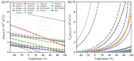 Anti-acceleration parameters of common working fluids at different temperatures. (a) σl/(ρl − ρv); (b) Psat/(ρl − ρv).