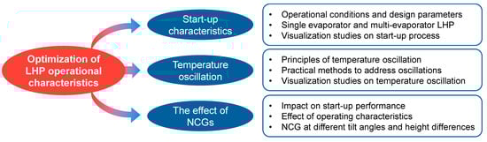 Research on optimizing the operational characteristics of LHPs is crucial for enhancing their heat transfer performance, operational adaptability, and stability. Current research focuses on startup behavior, temperature oscillations, and non-condensable gases (NCGs) [24]. Optimizing the startup process can improve the speed and reliability of heat transfer, allowing for rapid response in various environments [25]. Temperature oscillations during operation can affect system stability and efficiency. The research uses experiments and numerical simulations to analyze oscillation frequency and amplitude changes, exploring methods to control these oscillations [26]. Additionally, NCGs pose challenges during startup and operation by occupying space in heat transfer channels, increasing thermal resistance, and reducing efficiency. They also cause pressure fluctuations, complicating stable operation [27]. Therefore, analyzing LHP’s operational characteristics and exploring optimization strategies is essential.