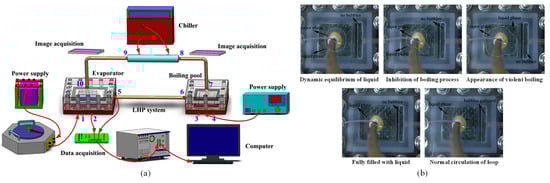 - Mo, D.; Zou, G.; Lu, S.; Zhang, L.W. A Flow Visualization Study on the Temperature Oscillations Inside a Loop Heat Pipe With Flat Evaporator. In Proceedings of the ASME 2013 International Technical Conference and Exhibition on Packaging and Integration of Electronic and Photonic Microsystems, Burlingame, CA, USA, 16–18 July 2013. [Google Scholar]